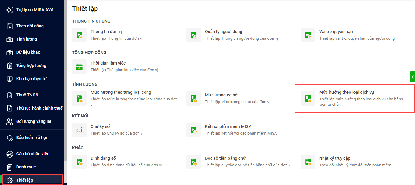 - Vào Thiết lập\Mức hưởng theo loại dịch vụ.