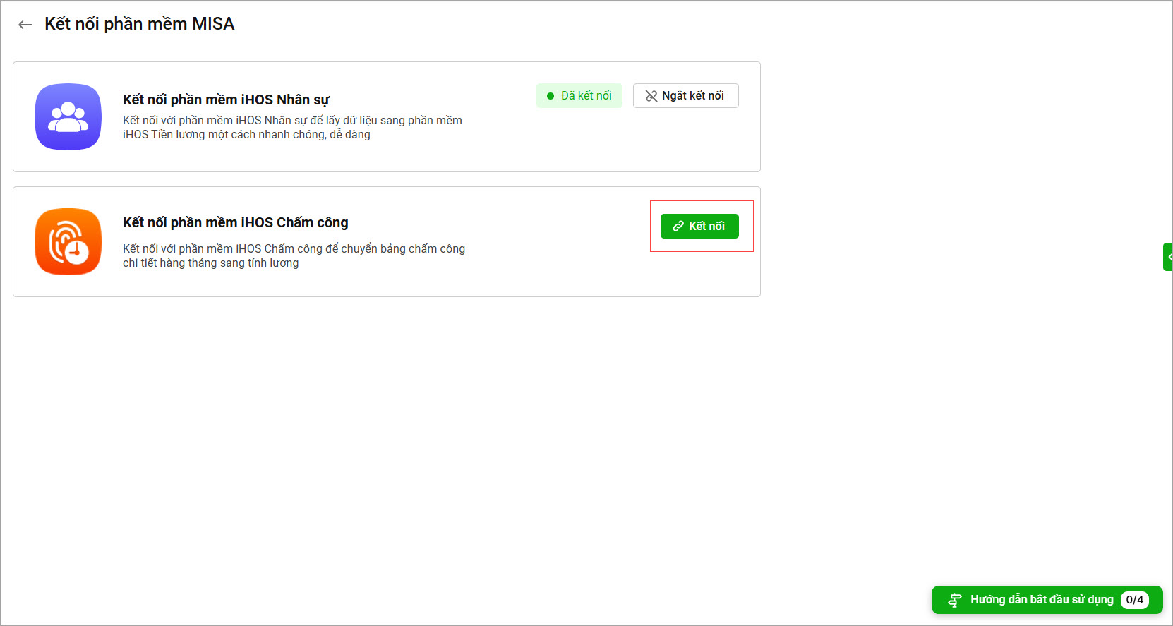 - Phần mềm cho phép kế toán tự kết nối với iHOS Chấm công để lấy dữ liệu chấm công. Lưu ý: Kế toán chỉ có thể kết nối được với iHOS Chấm công sau khi đã kết nối trước đó với phần mềm iHOS Nhân sự hoặc MISA QLCB. Việc này nhằm đảm bảo dữ liệu nhân sự và chấm công luôn đồng bộ, thống nhất giữa các phần mềm trên cùng nền tảng.