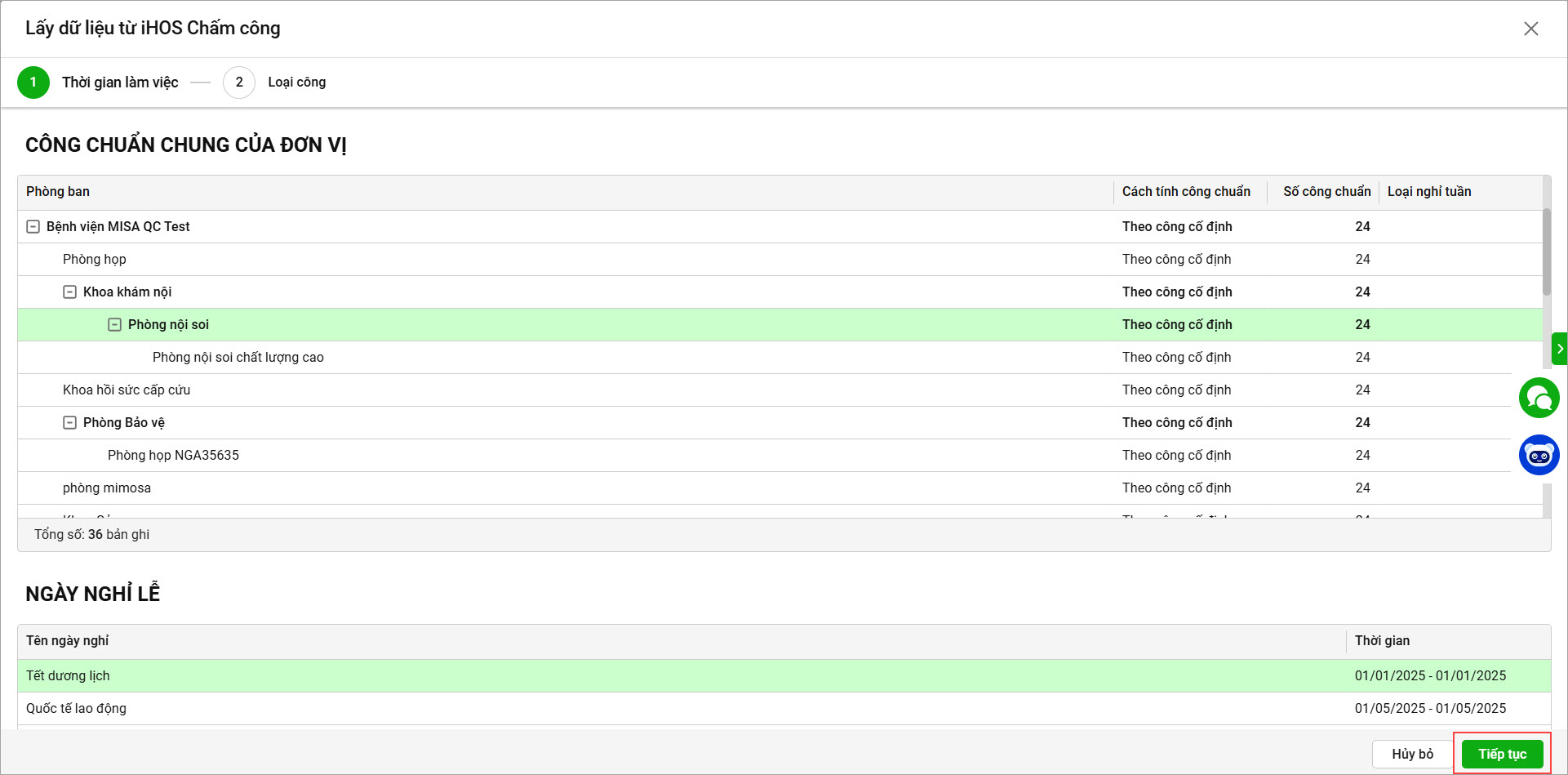 - Chọn Kết nối, Phần mềm hiện ra dữ liệu thời gian làm việc từ iHOS Chấm công. Anh/chị chọn Tiếp tục