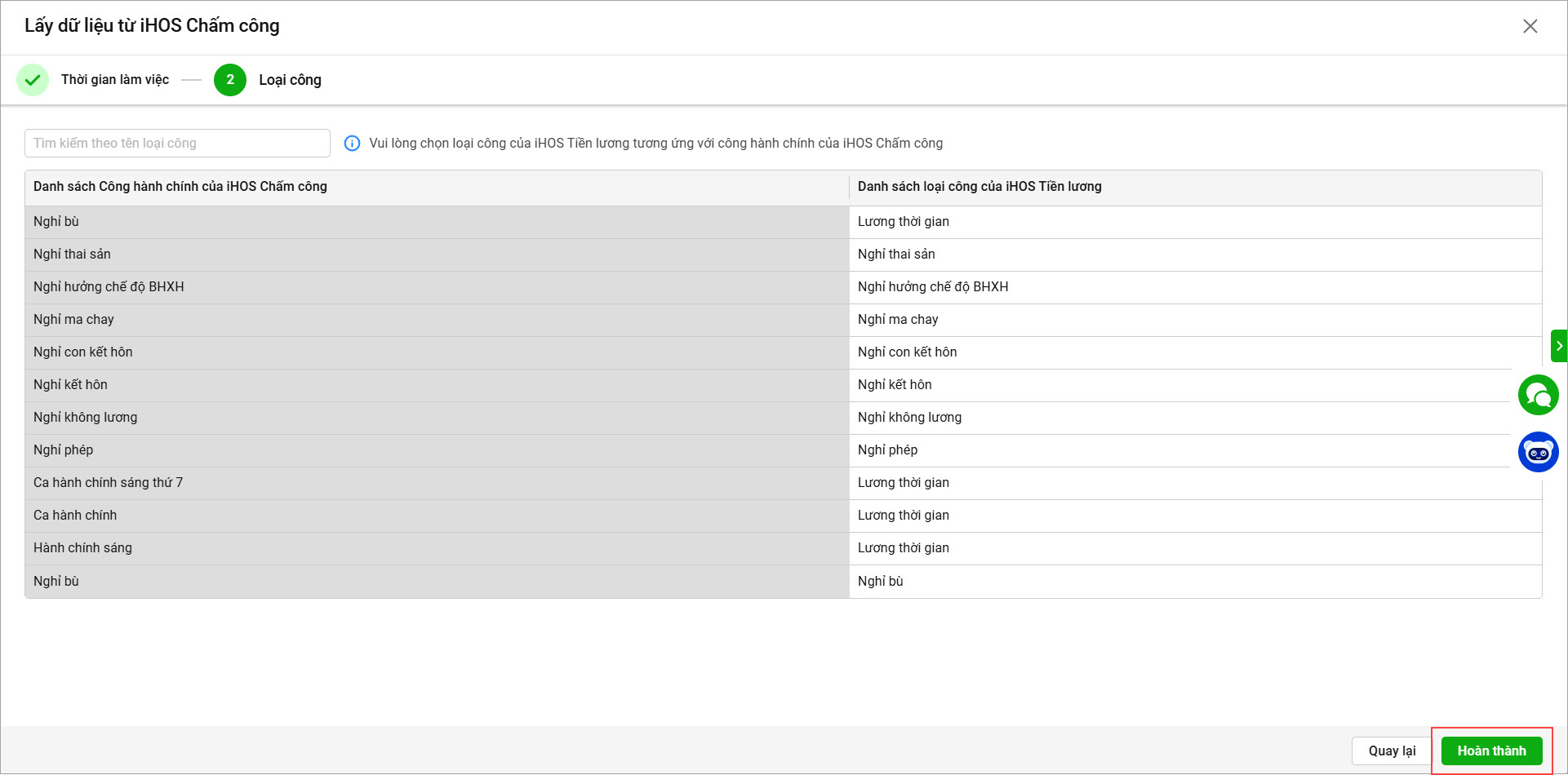 - Phần mềm hiển thị danh sách loại công của iHOS Chấm công, anh/chị kiểm tra và chọn loại công tương ứng với iHOS Tiền lương/MISA SalaGov, chọn Hoàn thành