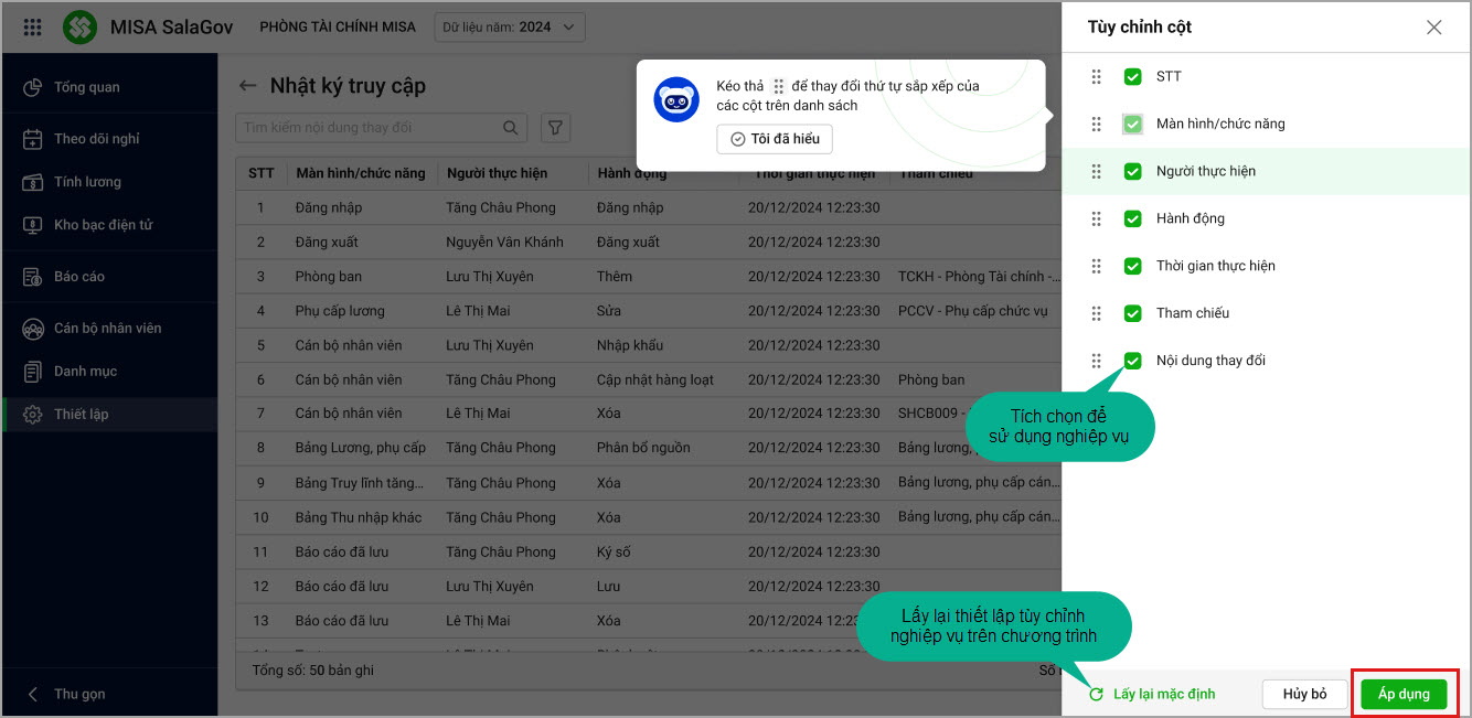 - Tích chọn để hiện cột thông tin, bỏ tích để ẩn cột thông tin, sau đó chọn Áp dụng