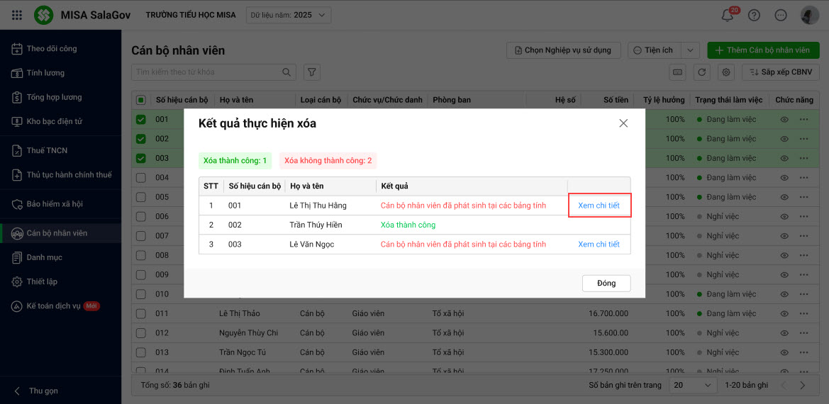 Khi anh/chị xóa một hoặc nhiều CBNV, nếu những nhân viên này đã có dữ liệu phát sinh (như bảng lương, thu nhập khác…), phần mềm sẽ thông báo kết quả thực hiện xóa.