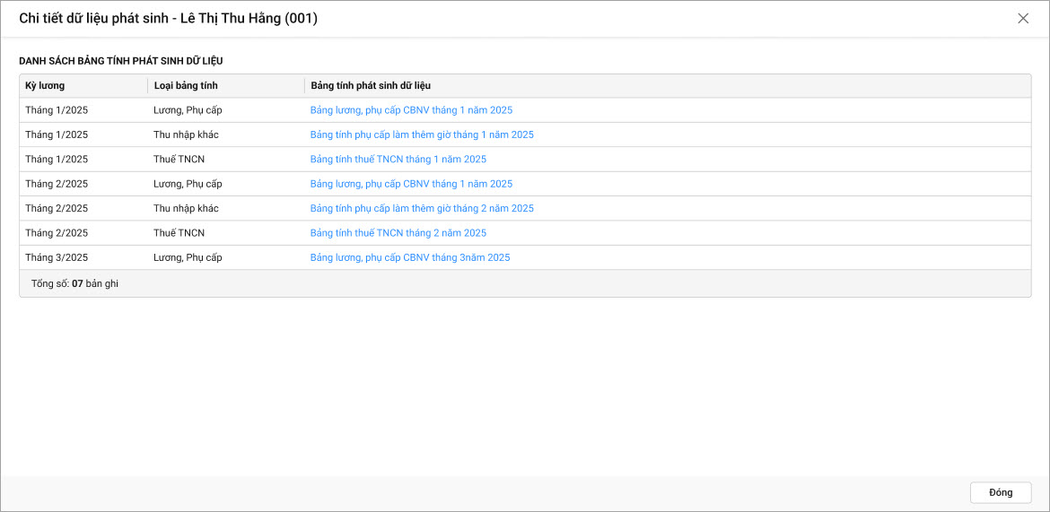 • Nếu anh/chị bấm xem chi tiết, phần mềm sẽ hiển thị danh sách các bảng tính có dữ liệu liên quan đến CBNV đó.