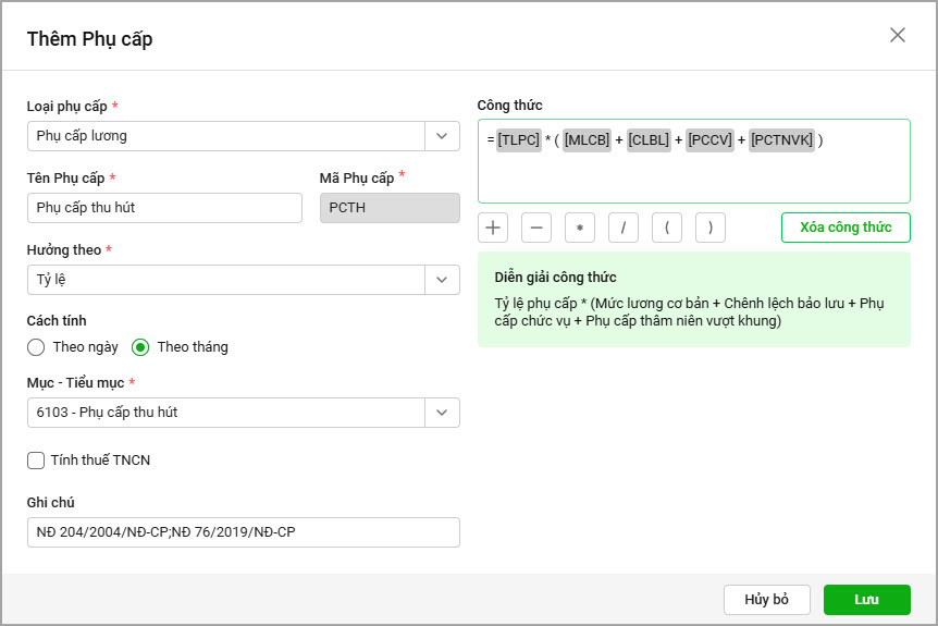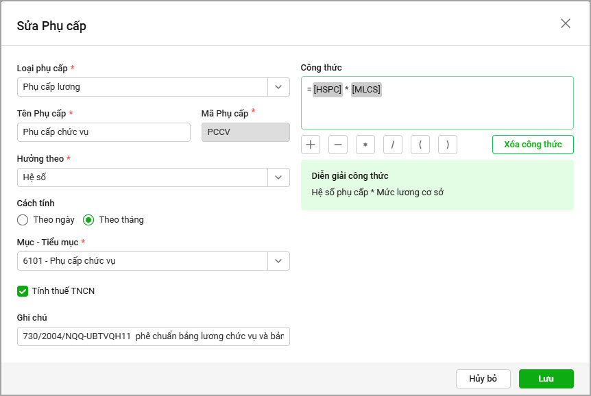 – Nhập tên phụ cấp: phần mềm sẽ tự động thiết lập các thông tin còn lại như công thức, hưởng theo, cách tính, mục – tiểu mục, v.v. Anh/chị chỉ cần kiểm tra và chỉnh sửa lại nếu cần theo nhu cầu của đơn vị.