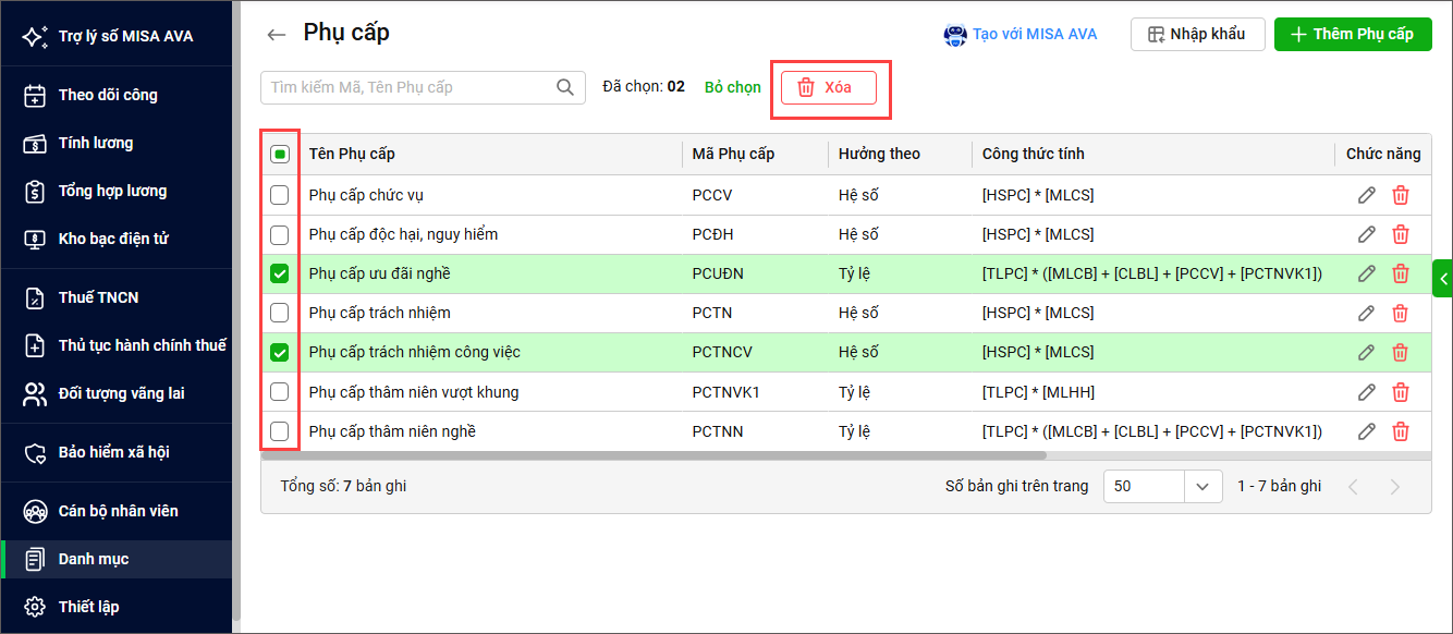 Bước 2: Để xóa Phụ cấp lương, tích chọn phụ cấp cần xóa và chọn biểu tượng