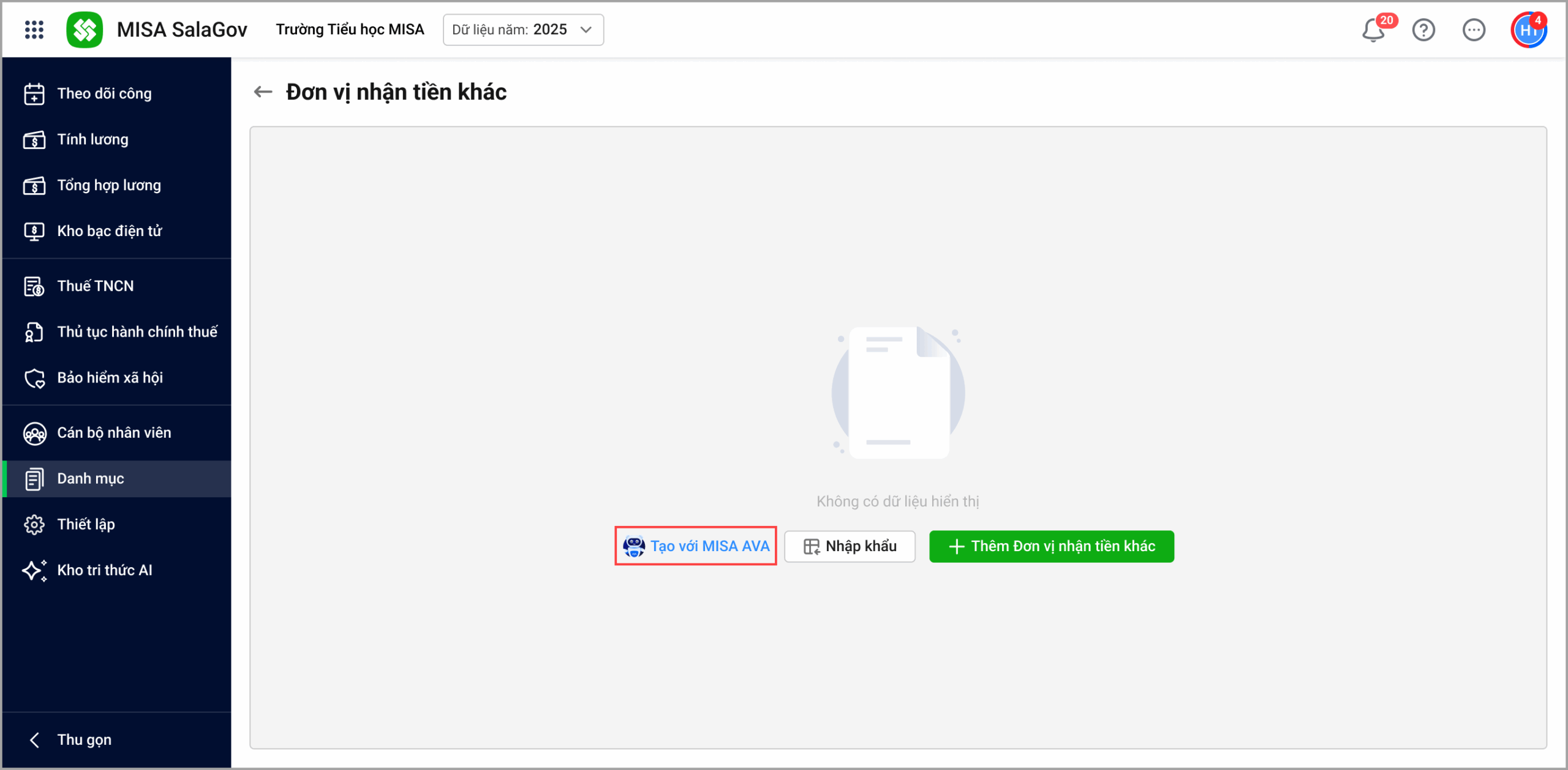 - Từ phiên bản R13: Trợ lý ảo AI hỗ trợ cán bộ tổ chức xây dựng danh mục đơn vị nhận tiền chỉ với vài thao tác trò chuyện, nâng cao hiệu quả công việc.