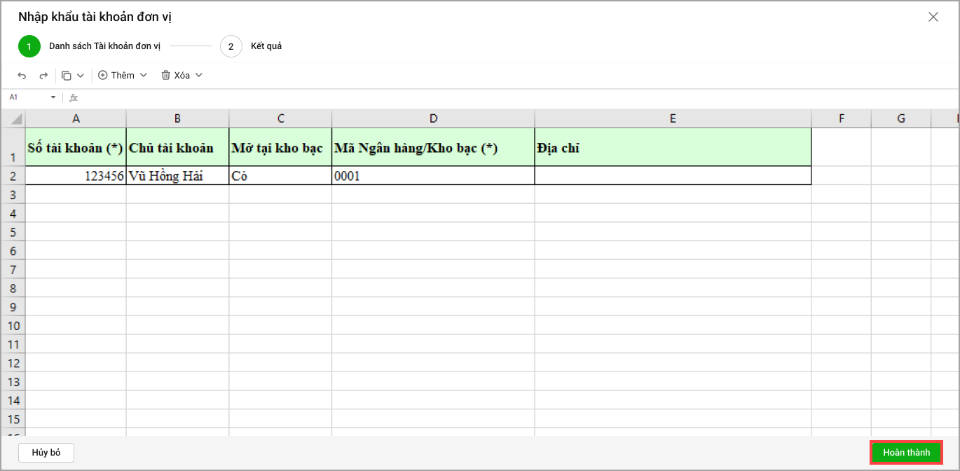 5. Anh/chị nhấn Hoàn thành để hoàn tất khai báo danh mục tài khoản đơn vị