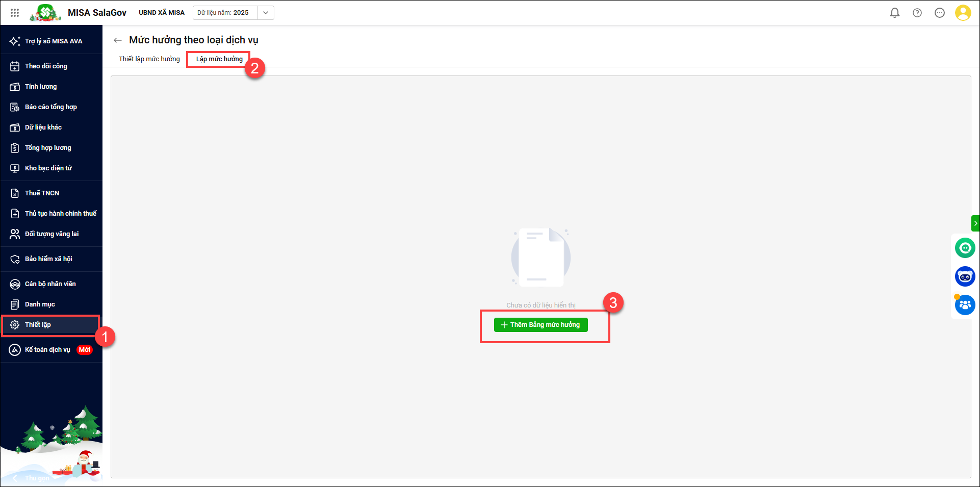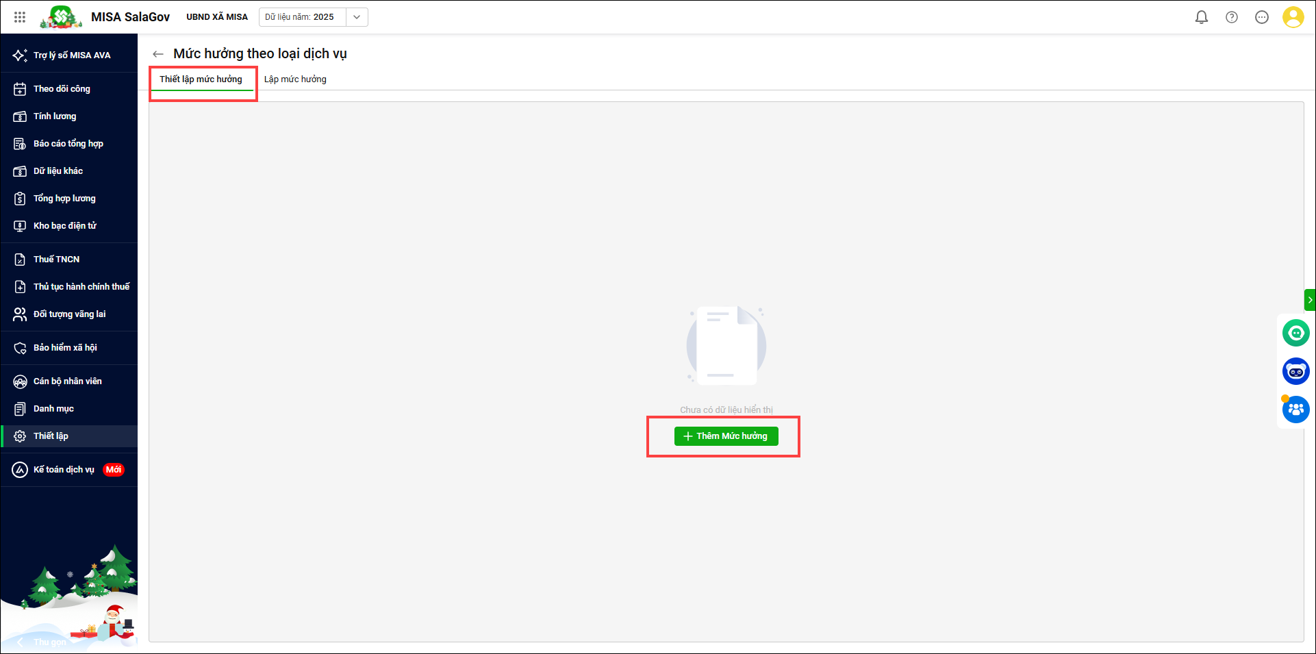 - Vào Thiết lập/ Mức hưởng theo loại dịch vụ. Chọn Lập mức hưởng. Nhấn Thêm bảng mức hưởng