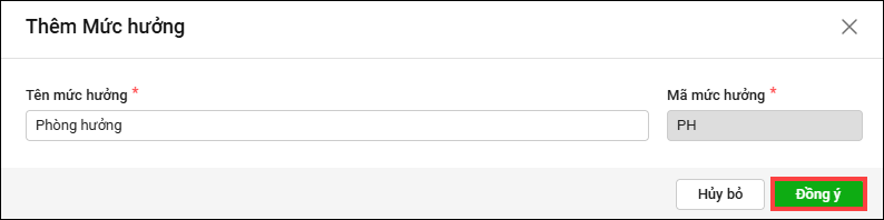 4. Anh/chị nhập tên mức hưởng, phần mềm tự động sinh mã mức hưởng tương ứng. Sau đó nhấn Đồng ý