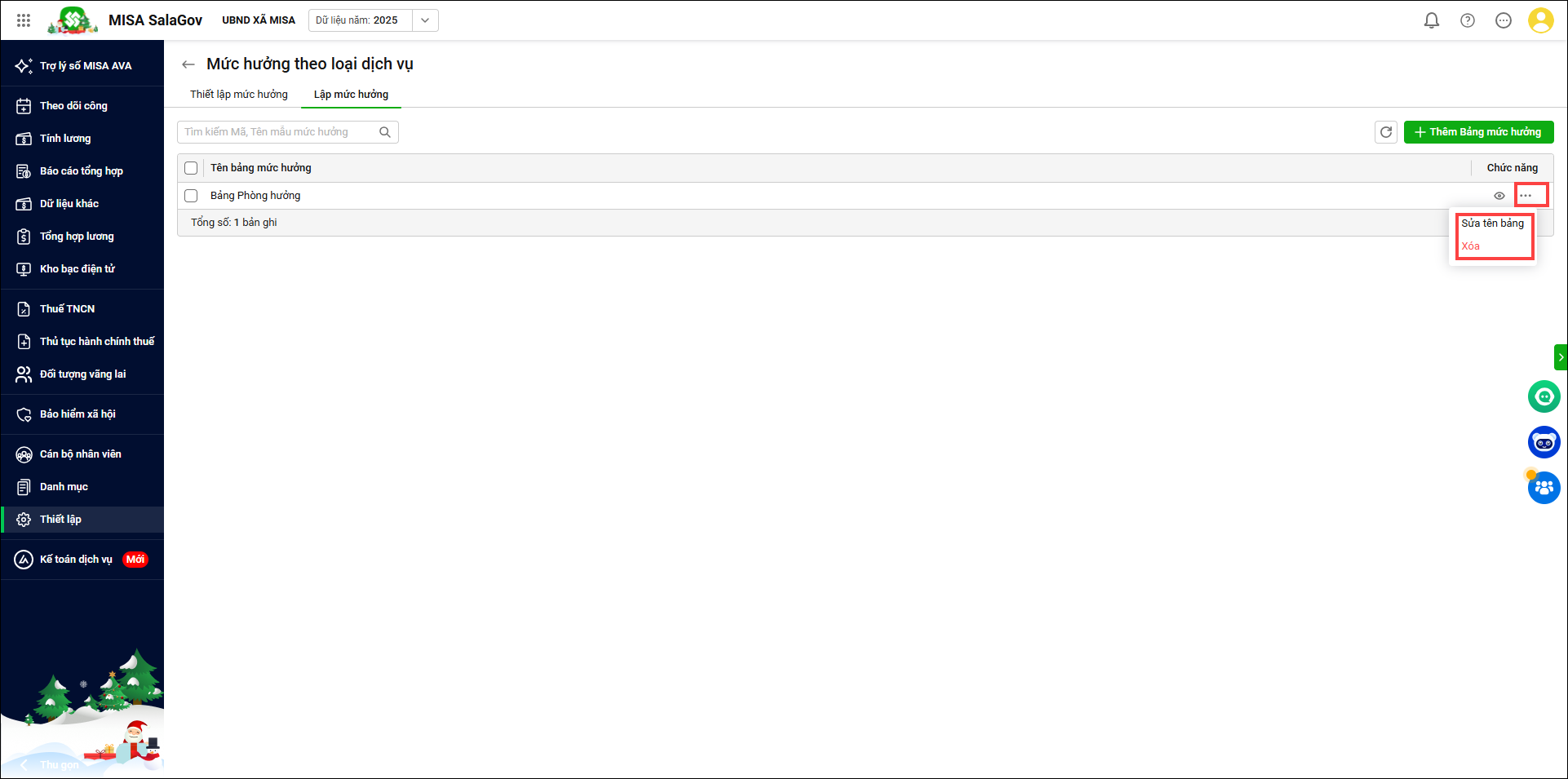 5. Anh/chị nhấn nút “…” sau đó thực hiện Sửa/xóa bảng hưởng đã lập.