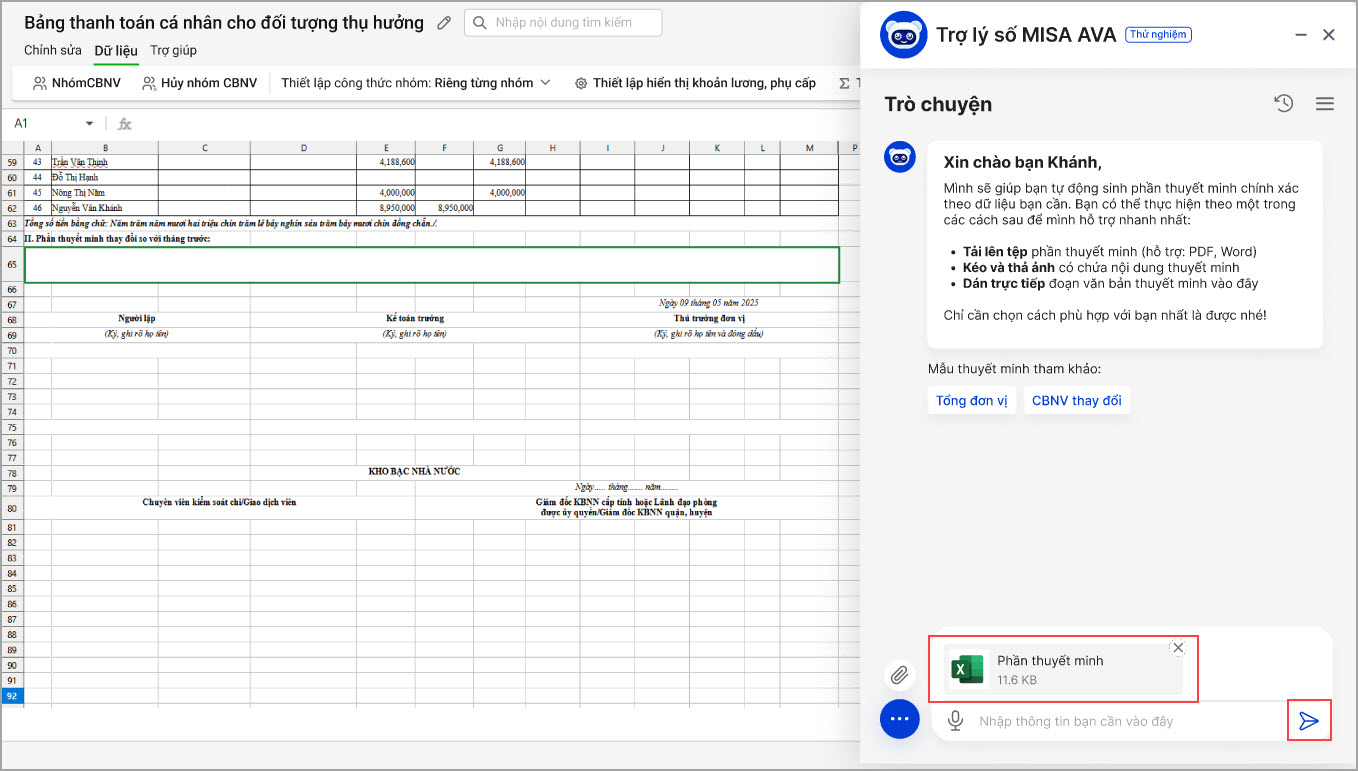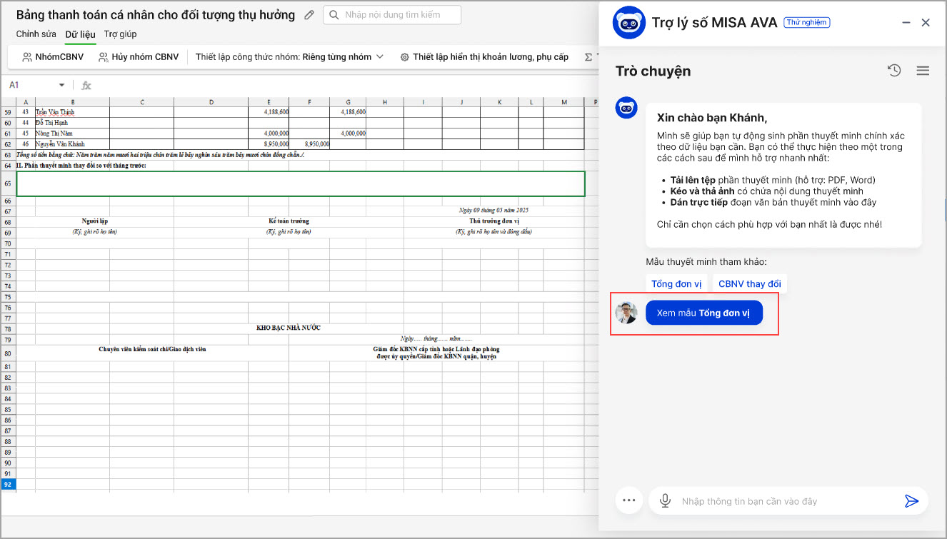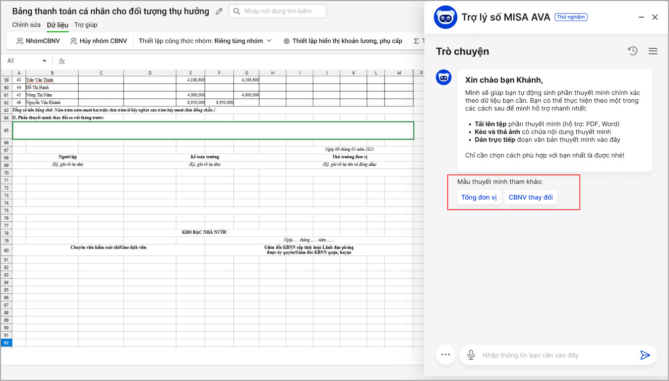 - AVA sẽ đọc nội dung trong file và tự động tạo bản thuyết minh phù hợp với dữ liệu thực tế của đơn vị.