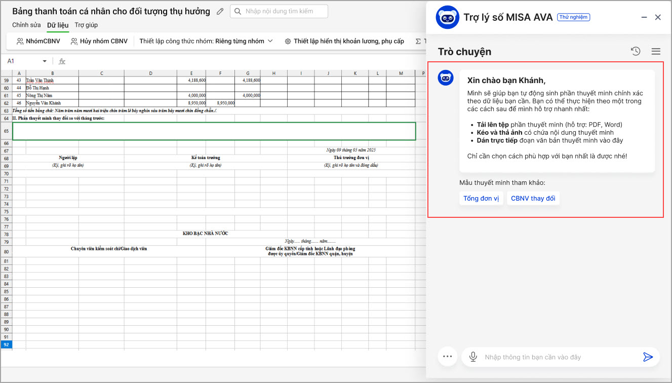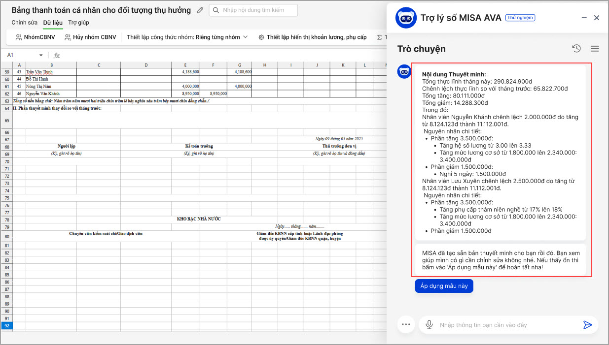 Khi lập bảng thanh toán 09, di chuyển chuột đến mục Phần II – Thuyết minh thay đổi so với tháng trước, Trợ lý số MISA AVA sẽ tự động hiển thị để hỗ trợ anh/chị tạo nội dung thuyết minh chính xác, dựa trên dữ liệu thực tế của đơn vị.