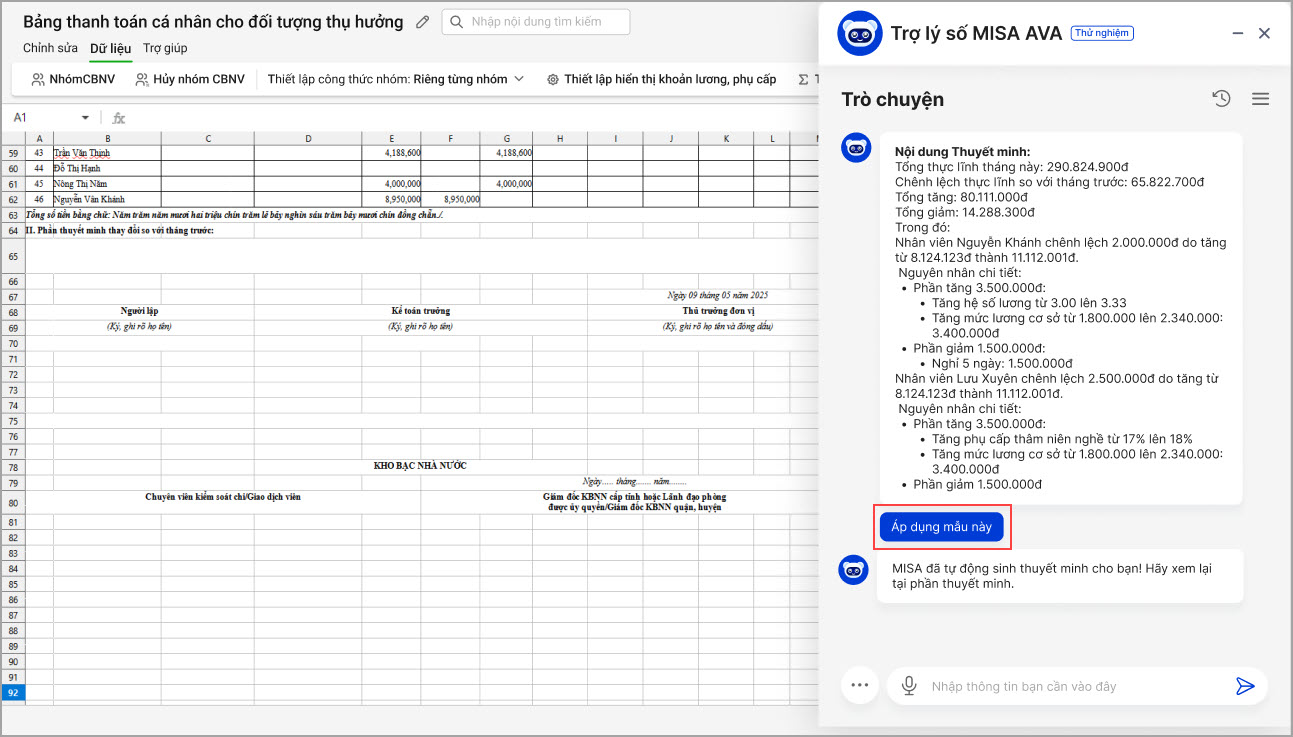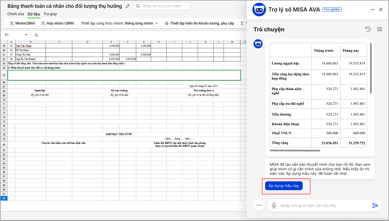 Lưu ý: Ở các kỳ lập bảng 09 tiếp theo, AVA sẽ ghi nhớ và hiển thị lại mẫu thuyết minh đã dùng trước đó. Nếu muốn tiếp tục sử dụng, chỉ cần chọn “Áp dụng mẫu này”