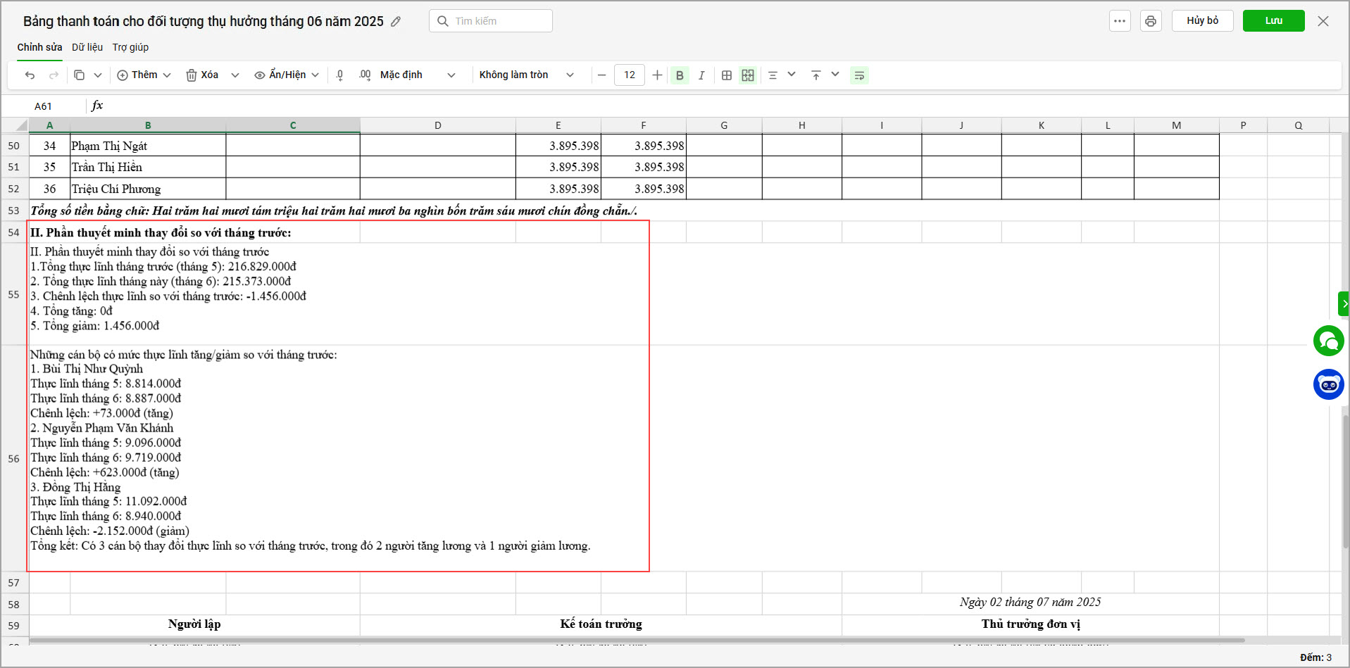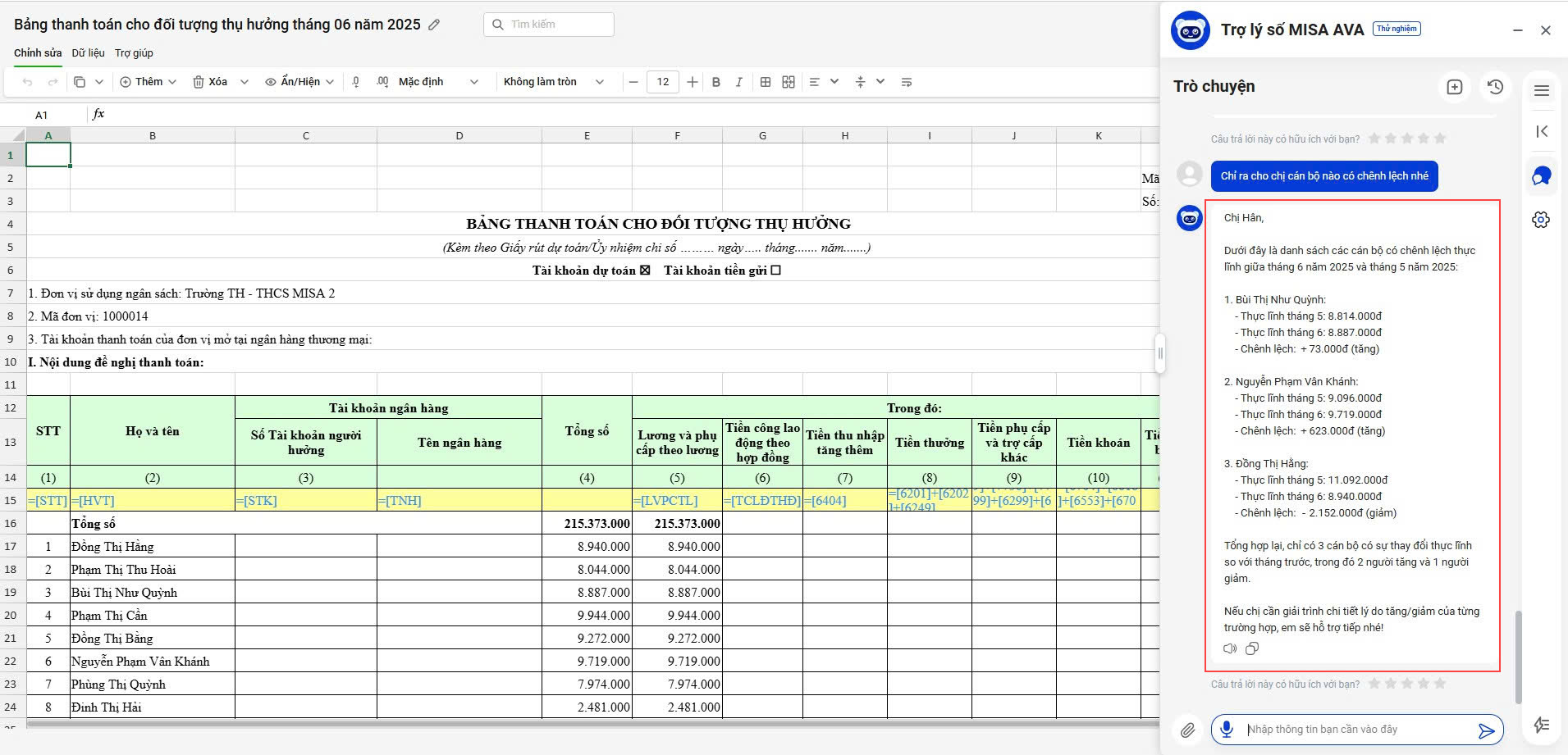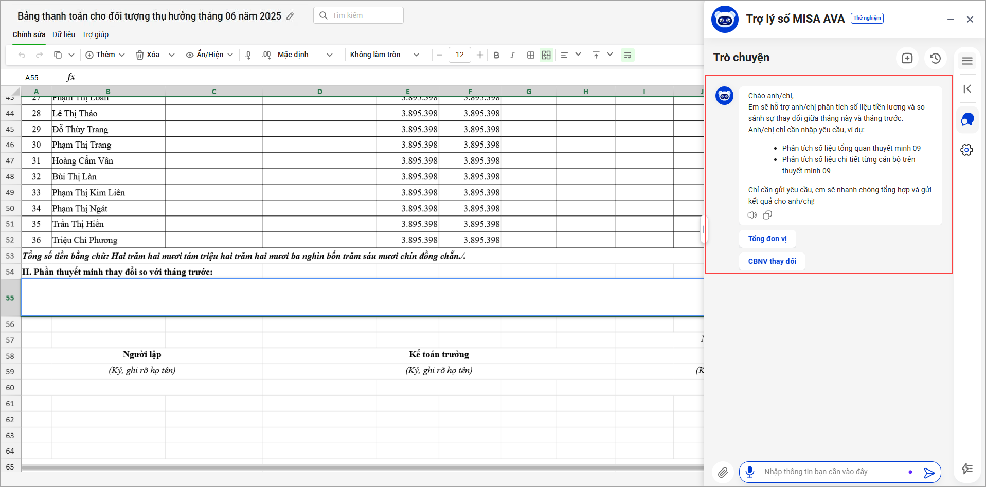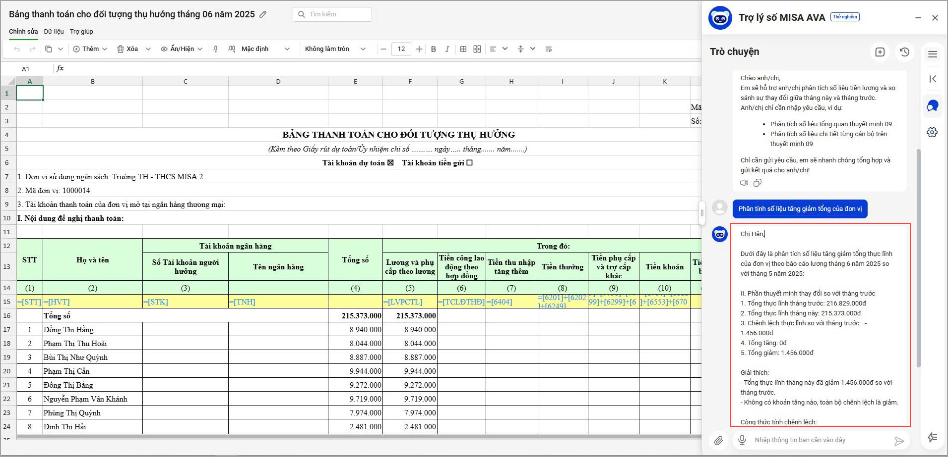 - Nếu muốn chi tiết hơn đến từng cán bộ thì anh/chị có thể yêu cầu: Phân tích số liệu chi tiết từng cán bộ trên thuyết minh 09, AVA sẽ cung cấp ngay danh sách chi tiết cùng lý do thay đổi giữa các tháng.